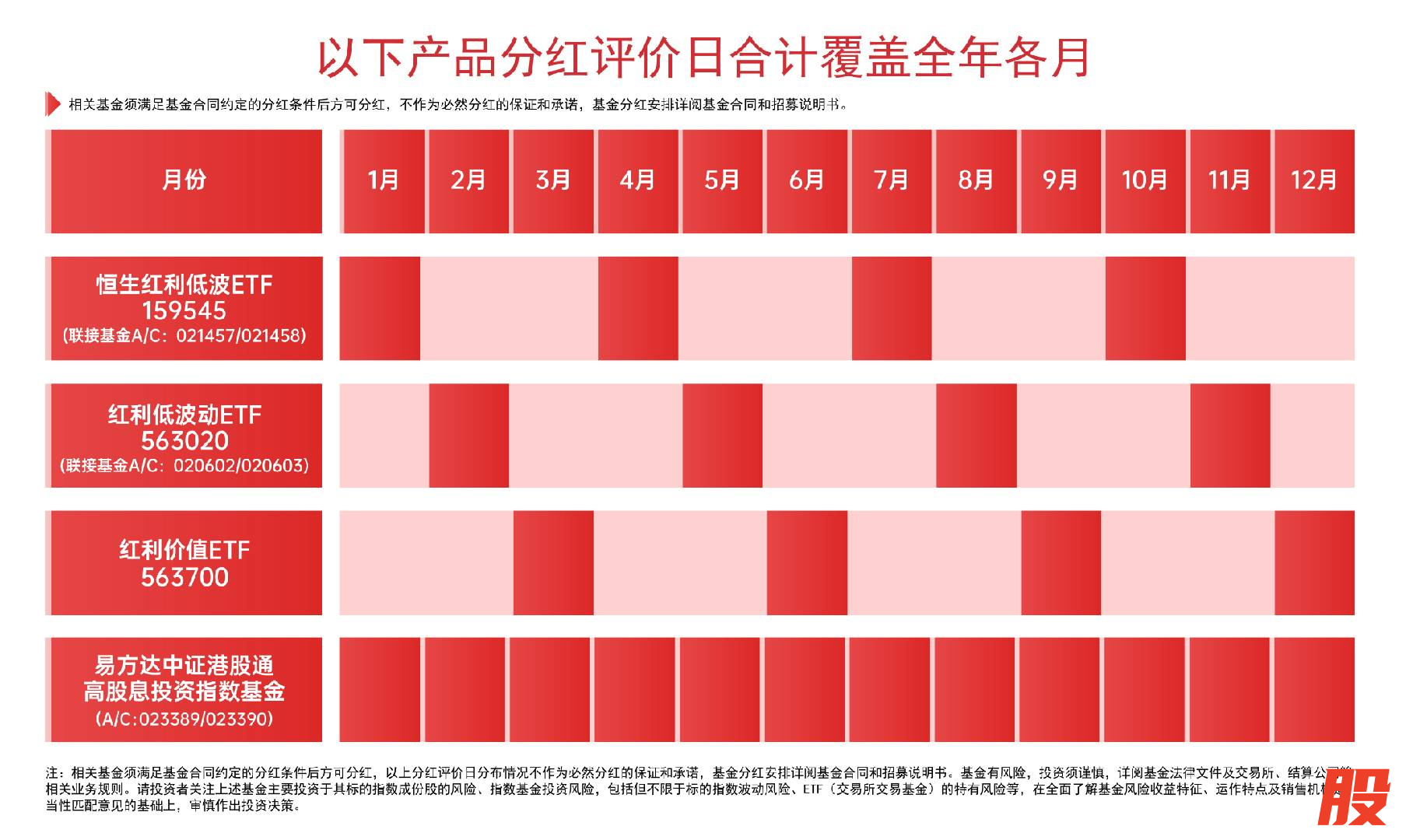 例如,恒生红利低波ETF及其联接基金每年1月、4月、7月、10月进行分红评估,红利低波动ETF及其联接基金每年2月、5月、8月、11月进行分红评估,红利价值ETF每年3月、6月、9月、12月进行分红评估,产品满足条件后可按约定分红。因此,若投资者同时持有这三只产品,则有机会每个月都获取现金分红。